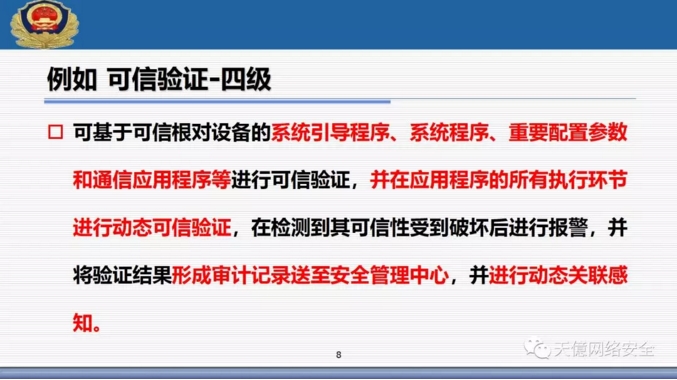 (3)新標準里把可信計算使用寫入了標準范圍,從一級開始到四級全部提出了可信驗證空間。 ?